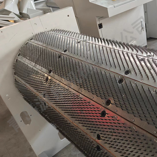 把纖維、原料經(jīng)喂入平簾輸送至喂入羅拉,再由開松輥高速開松后,經(jīng)輸棉風(fēng)機以適量的風(fēng)量輸送纖維原料供后遞工作使用。經(jīng)本機開松后的纖維、原料效果好,均勻、細致。